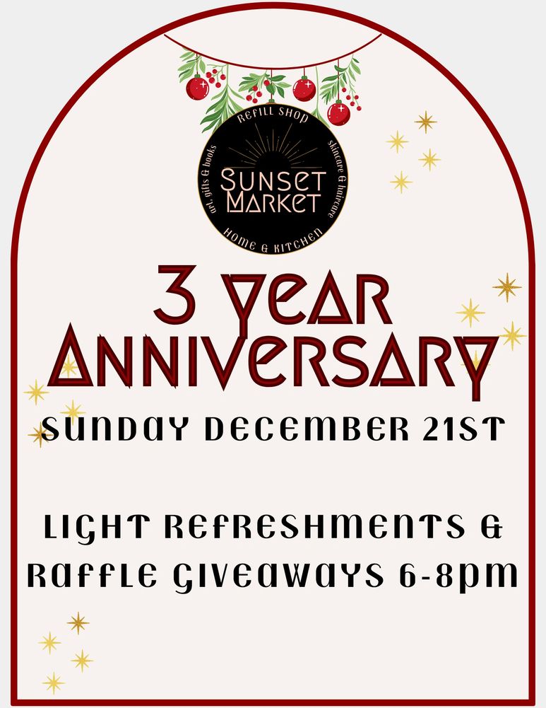 Join us for our 3 year anniversary on 12/21! Holiday hours:
