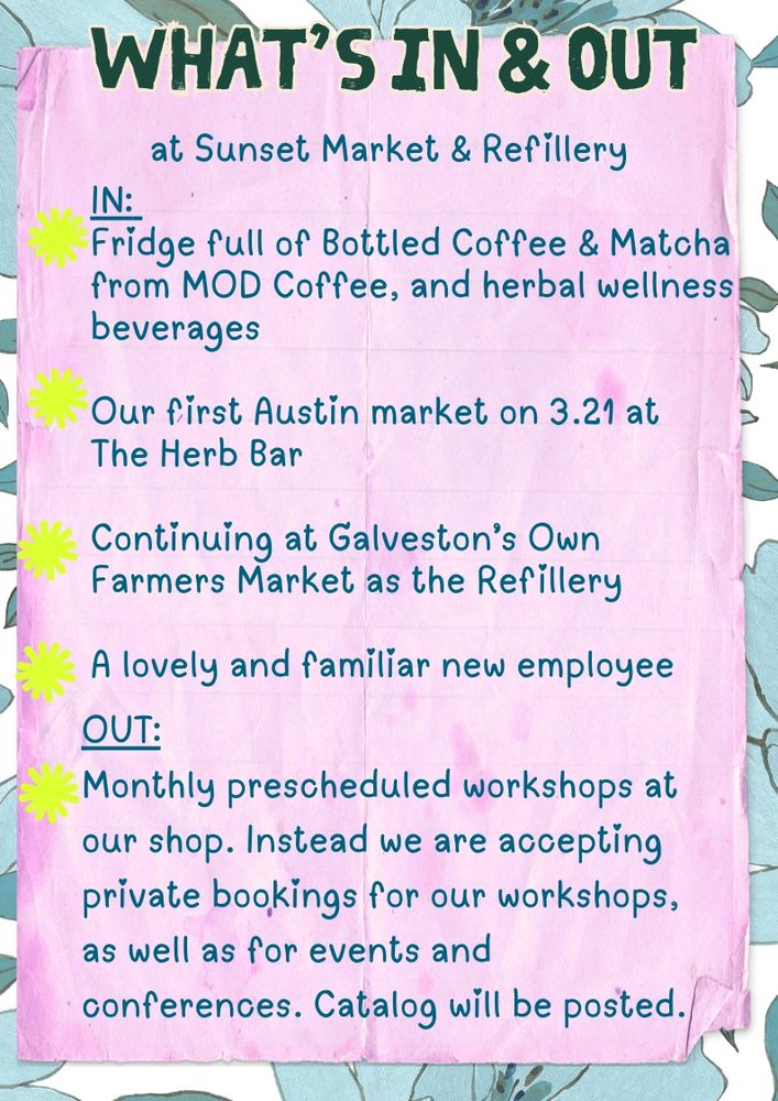 Sunset Market was founded in 2022 by Danielle Colombo, a local Galveston resident. We started out on the Seawall and have now relocated to 406 23rd (Tremont) St., situated conveniently between Proletariat Gallery and Old Moon Deli. At our Refill Shop, we offer a variety of natural soap products, emphasizing our commitment to zero waste and herbal ingredients.